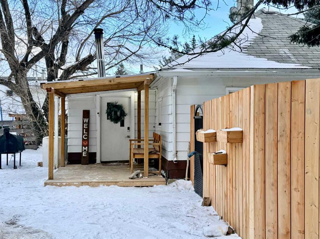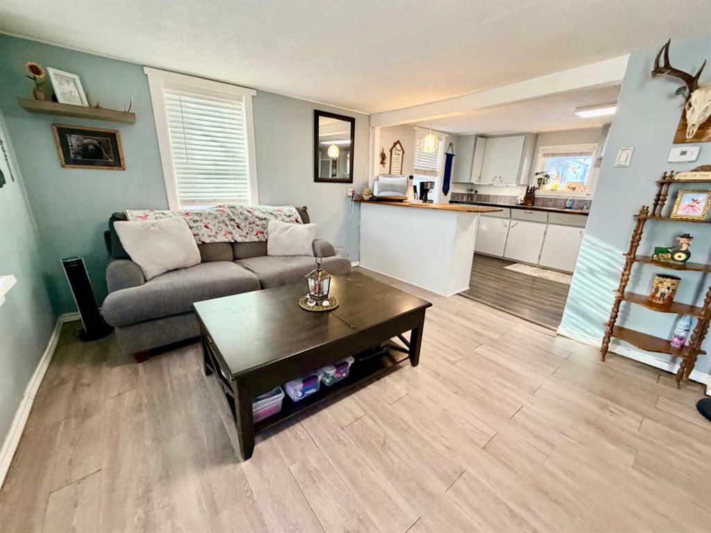 Affordable and cozy one bedroom home in the quiet community of Leslieville. You conveniently enter the home from the side entry way that has a newer covered front patio and once inside you'll find the oversized back porch with a free standing wood stove, laundry area and hot water tank that was replaced in 2024. Moving into the galley style kitchen there's a gas stove, large fridge, dishwasher and eating counter. The space opens up to the living room where a propane floor furnace helps keep it nice and cozy...
