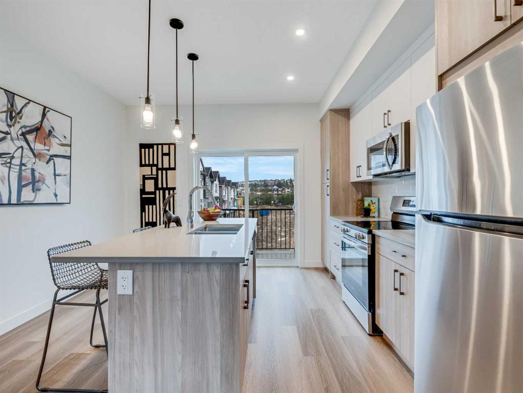 Step into a life of style and ease with this gorgeous, three-story townhome nestled in the highly sought-after Westmount, Okotoks community. Built by the trusted team at Slokker Homes, this property is your launchpad for modern living in a prime, family-friendly location. The bright, open-concept main floor is designed for seamless entertaining. You'll love the airy feel created by soaring knockdown ceilings and the flow of the durable vinyl plank flooring. The kitchen is a true showstopper: Quartz counters...