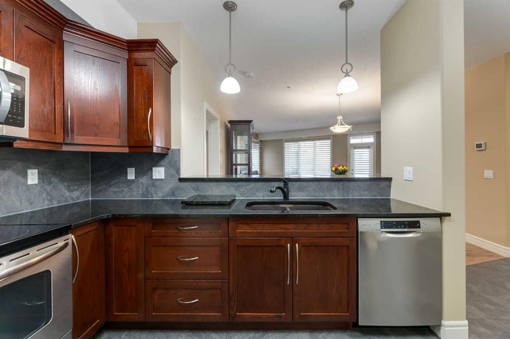 ENJOY outstanding amenities at SANDERSON RIDGE on Fish Creek Park! The first time on the market, this third floor suite is spacious and bright with a neutral decor. It offers TWO bedrooms, TWO bathrooms, TWO oversized titled parking stalls with TWO locked storage rooms on P2. The sleeping areas are separated by the open kitchen, living and dining area layout. The large u-shaped kitchen includes a walk-in pantry, granite counters, eating bar, tile floors and stainless appliances. The living and dining r...