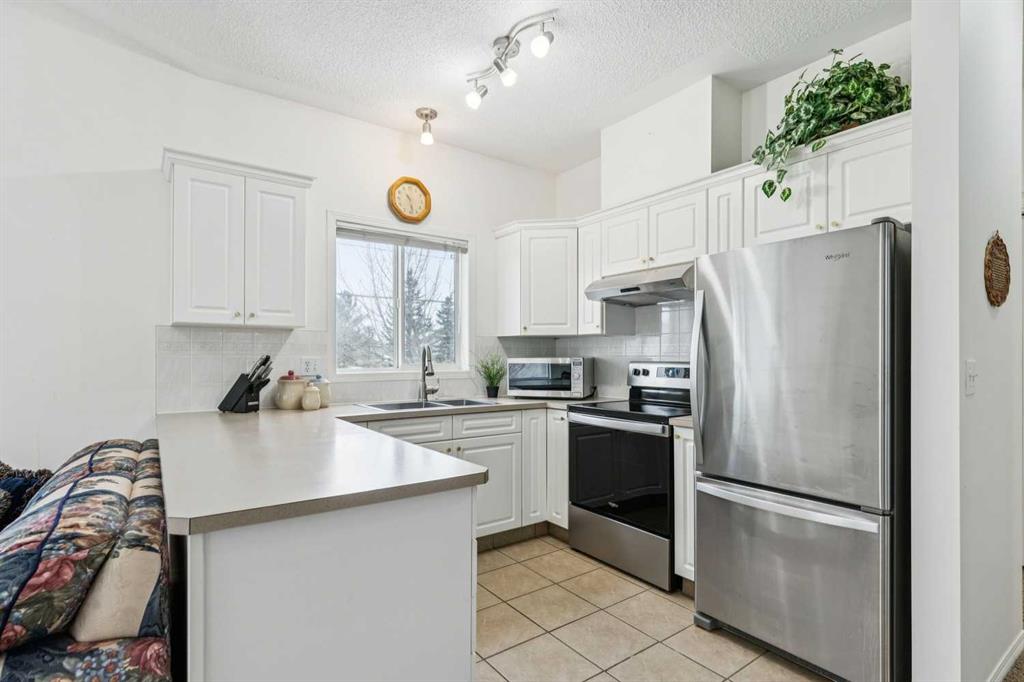 Top-floor corner unit with 9-foot ceilings in the Fairways Pavilions complex. This 2-bedroom, 2-bathroom condo offers an open layout with a tiled foyer, vaulted ceilings, and good natural light from large windows. The kitchen features a wrap-around counter with a breakfast bar and a separate eating area. The living room includes a corner gas fireplace. The primary bedroom has a walk-in closet and a 3-piece ensuite. The second bedroom is next to a 4-piece bathroom. There is in-suite laundry with additional s...