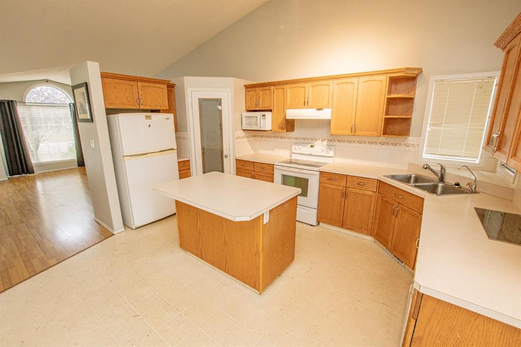 Welcome to this inviting bungalow that’s ready for your personal touch! The home opens to a bright, tiled entryway leading into a spacious living room with a large picture window that fills the space with natural light. The open concept kitchen offers a functional layout with a corner pantry, center island, and cozy dining nook - perfect for family meals or entertaining. Patio doors off the dining area lead to a deck overlooking the fully fenced and landscaped yard, ideal for outdoor enjoyment. The main lev...